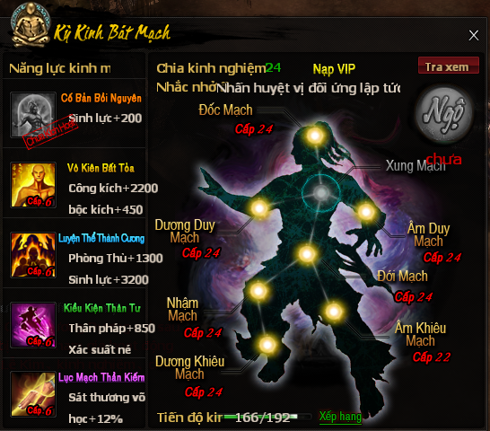 Kinh mạch rất quan trọng trong thế giới võ hiệp. Kết hợp với y học huyệt vị, căn cứ kinh mạch khác nhau sẽ cộng thêm chỉ số thuộc tính khác nhau, cấp độ càng cao cộng càng nhiều, cần đả thông tám kinh mạch mới giúp nâng võ công và thuộc tính lên một tầng cao mới, trở thành bậc tông sư.